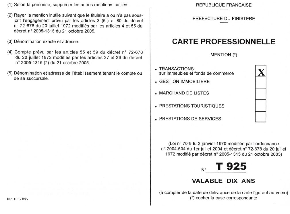 Carte professionnelle mention "Transactions sur immeubles et fonds de commerce" n°T925 délivrée par la préfecture du FinistèreCarte professionnelle n°CPI 29012015000000318 délivrée par la CCI 29 et consultable depuis:htthttps://www.cci.fr/agent-immobilier/documents/AGENCE-FINIST-ARMOR/cartes/CPI29012015000000318 Assurance Responsabilité Civile Professionnelle [RCP, Generali IARD]