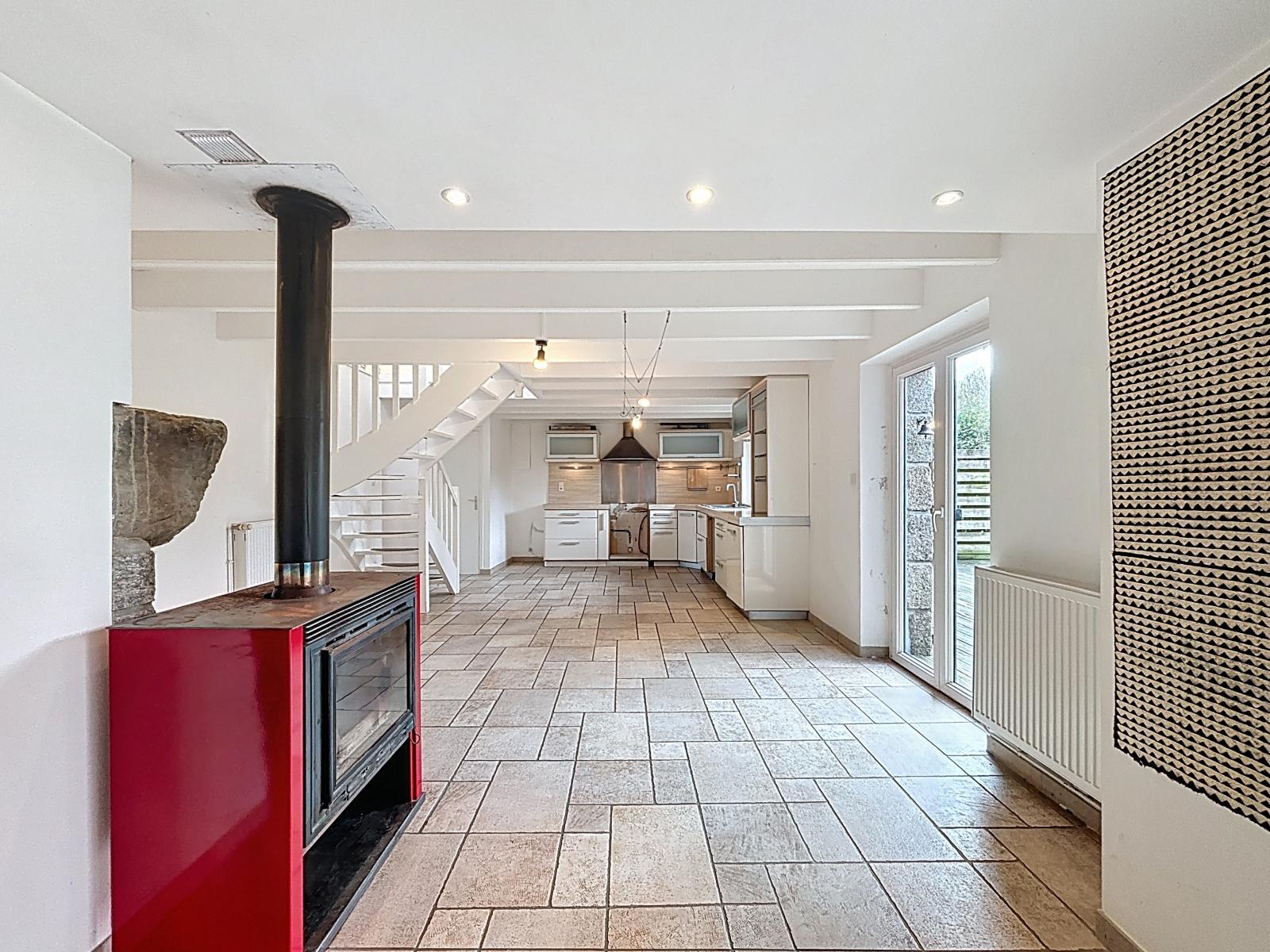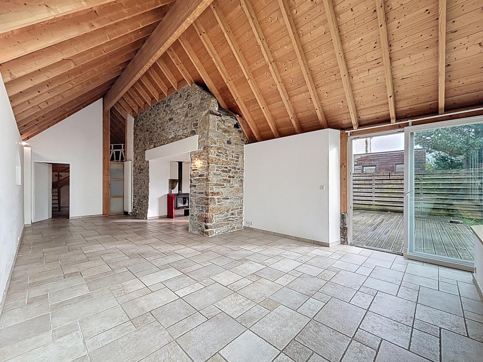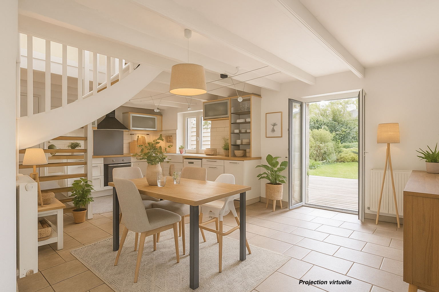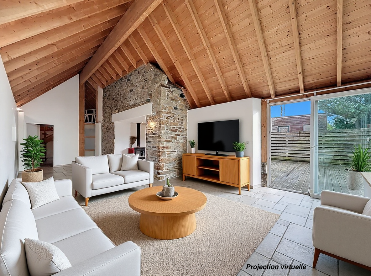 - Au rez-de-chaussée, vous serez séduit par un vaste double séjour baigné de lumière, agrémenté par un plafond cathédral en bois qui met en valeur l’esprit typiquement breton de la maison.