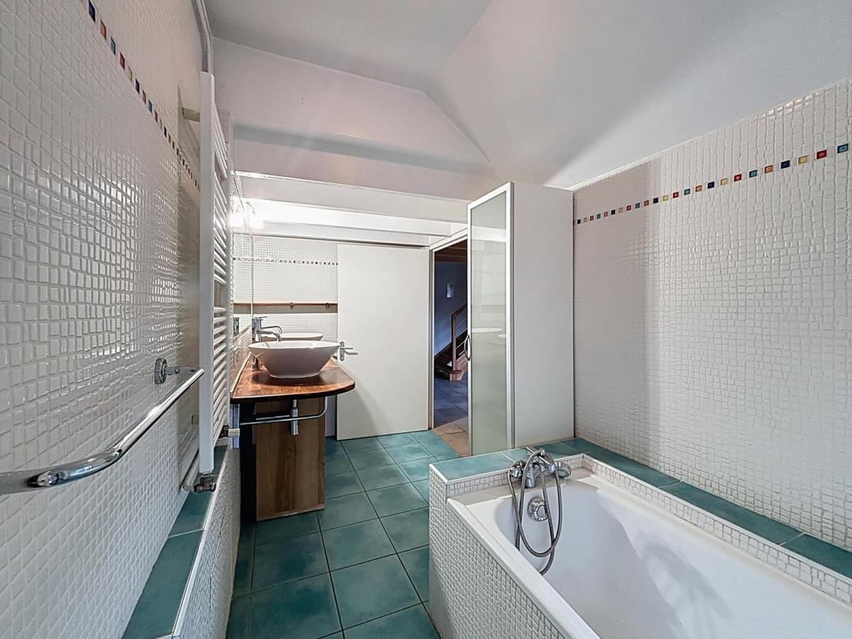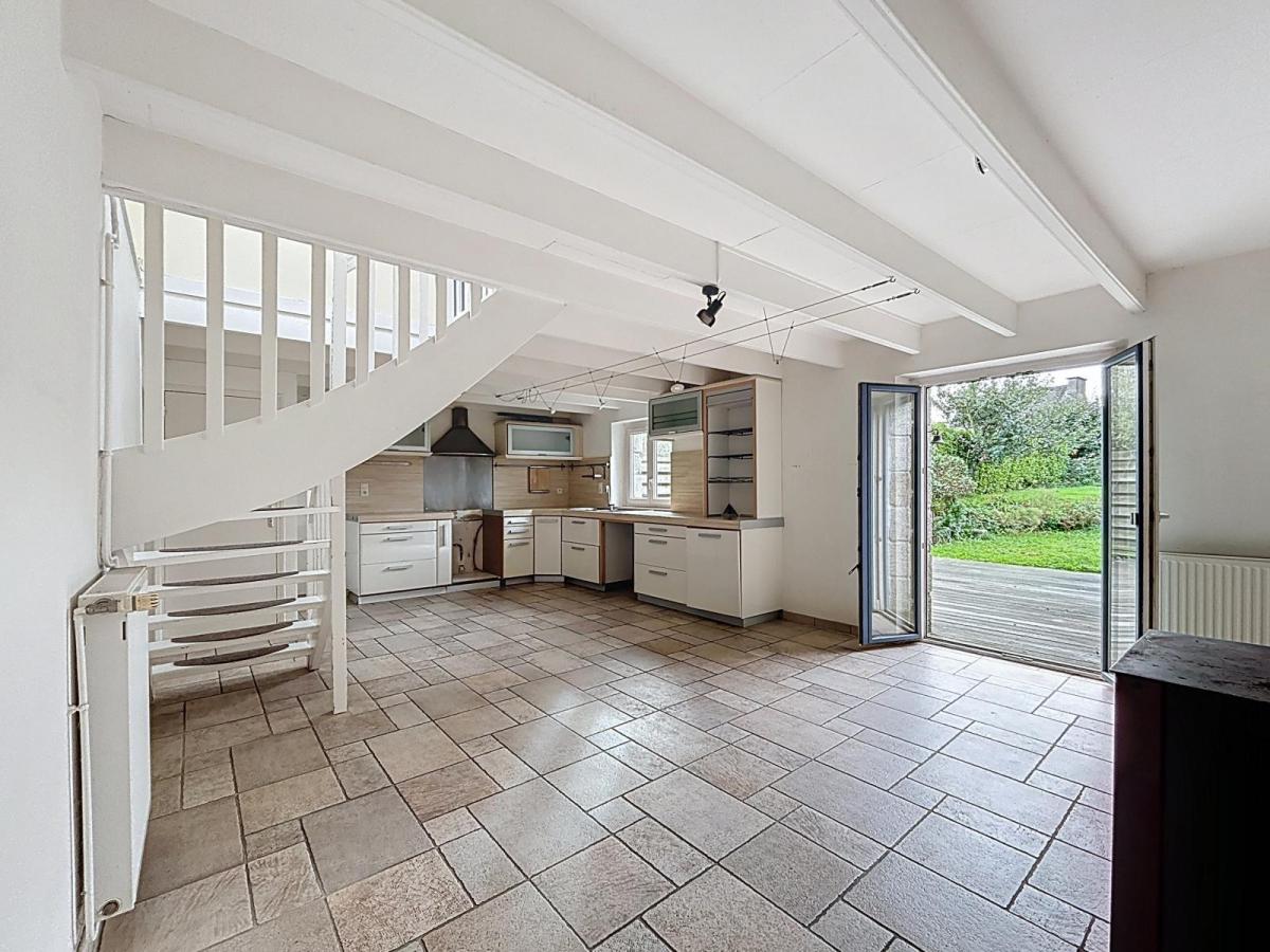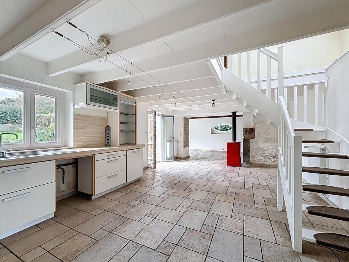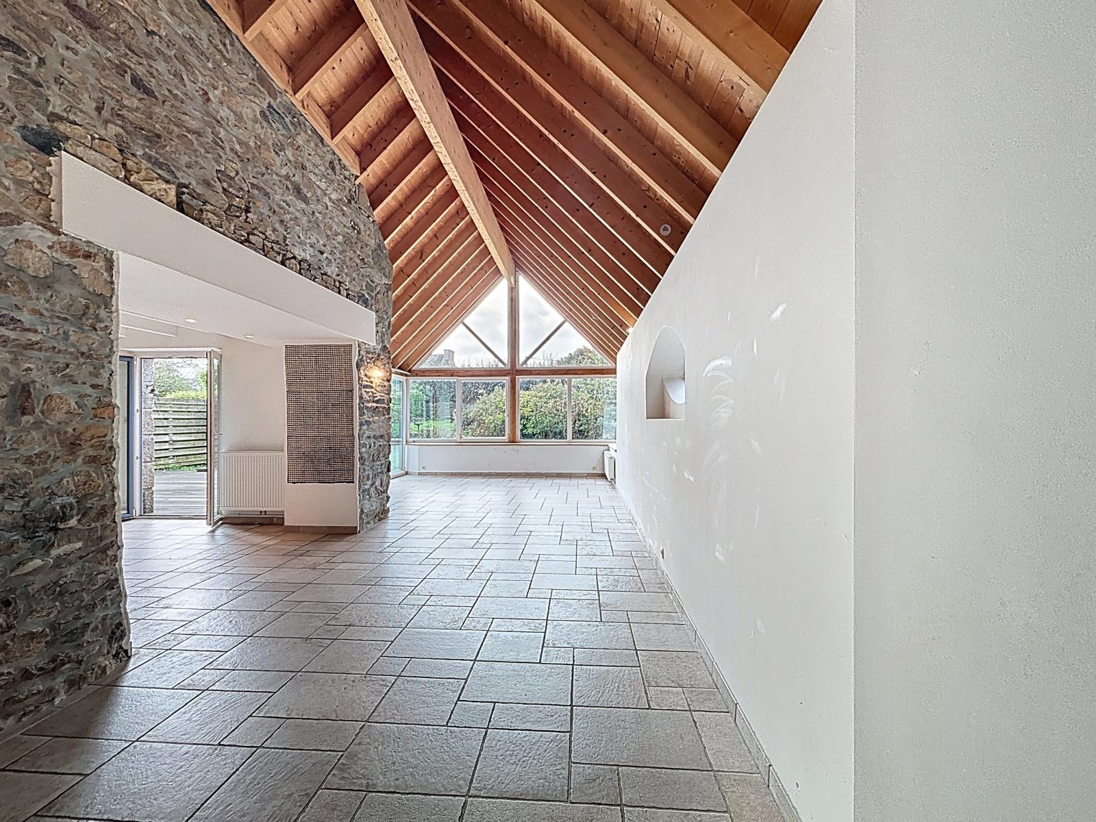 - Au rez-de-chaussée, vous serez séduit par un vaste double séjour baigné de lumière, agrémenté par un plafond cathédral en bois qui met en valeur l’esprit typiquement breton de la maison.