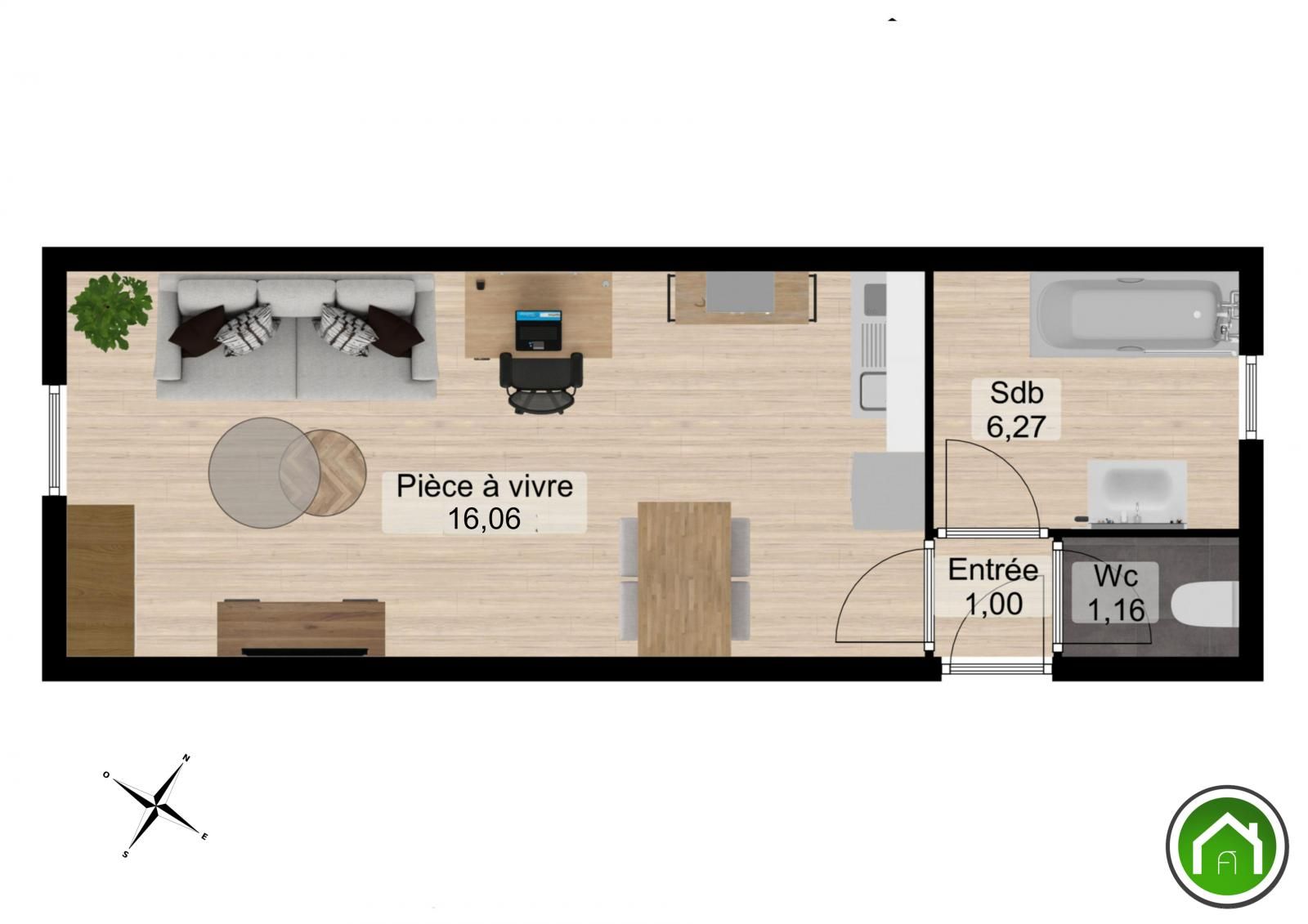 Les intérieurs, de 24,37m², sont agencés de la manière suivante : une entrée, une pièce de vie avec espace cuisine, une salle de bains, un wc indépendant.